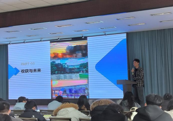 首先,围绕“机遇与行动”展开分享,徐兴博提到,在中国邮政储蓄银行和中国南方航空的招聘中,他凭借扎实的财务管理专业基础和提前准备的面试预案,顺利通过笔试与面试,成功获得录用通知。其次,他特别提到专业实践学期的实习对自己的帮助,称这段经历是将课堂知识转化为实践能力的平台,并建议学弟学妹们珍惜学校提供的实践机会,认真对待每一个实践岗位,在实习中明确职业方向、提升核心竞争力。