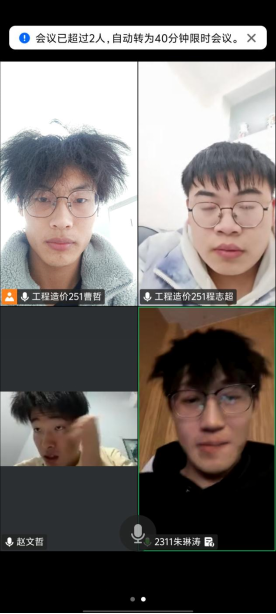 为进一步凝聚实践共识、优化协作模式,推动社会实践学期任务高效落地,土木与管理学院造价251曹哲小组于1月8日召开专题交流会。本次会议以“分享实践成果、破解技术难题、明确后续方向”为核心,小组成员曹哲、程志超、赵文哲、朱琳涛参会,围绕实践开展情况展开深度研讨。