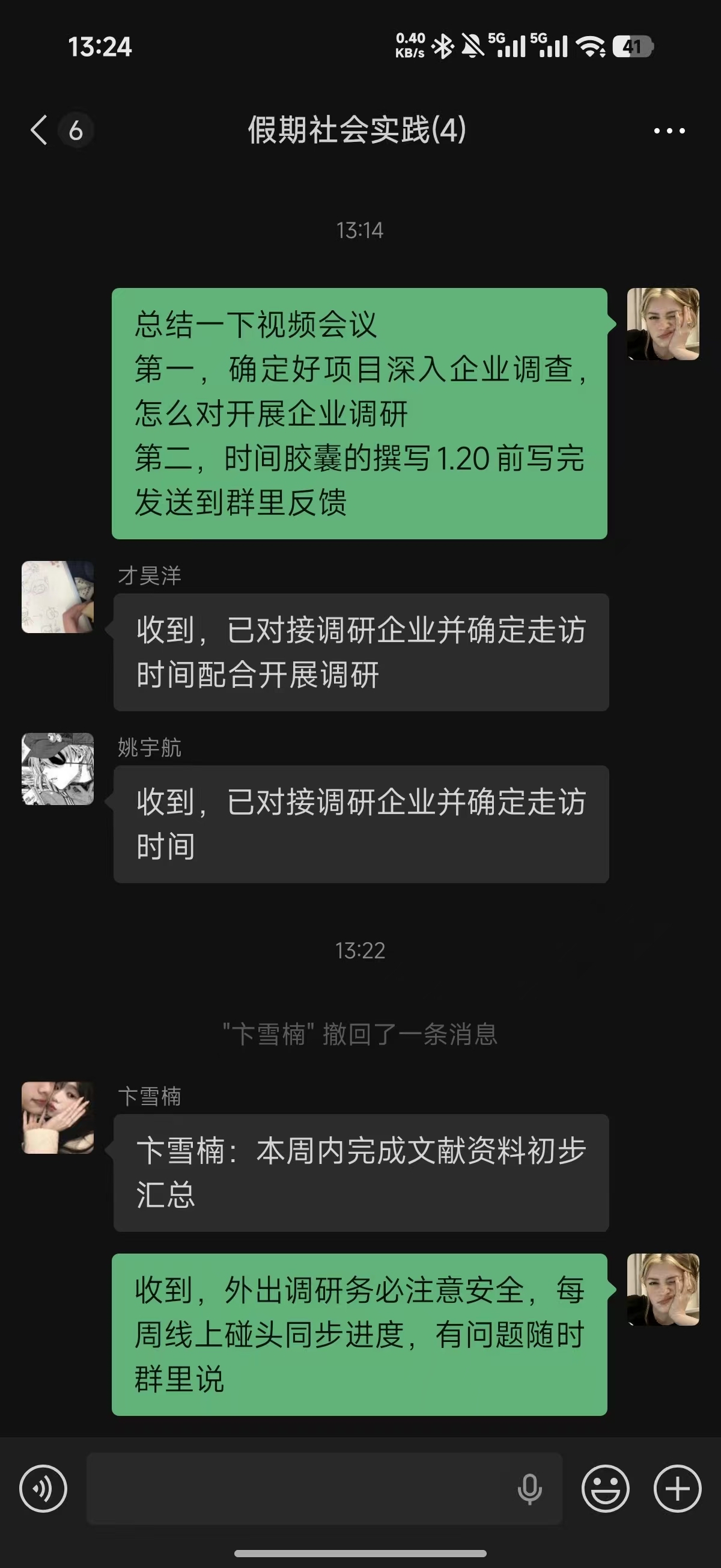 会后组员迅速行动,才昊洋、姚宇航已确定装配式内装项目走访时间,卞雪楠完成相关文献搜集,三名成员初步对接调研企业。全体组员承诺按节点推进,确保1月7日敲定调研企业、1月20日前完成时间胶囊撰写,高效推进社会实践落地。