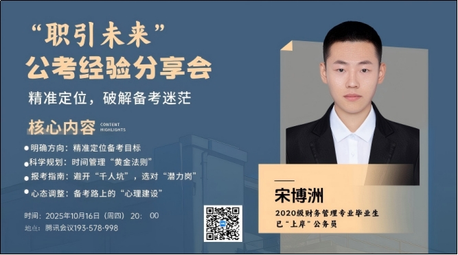 为充分发挥优秀毕业生的就业引领作用,帮助2026届学生明确备考方向,10月16日,土木与管理学院生涯导师马金英精心组织了优秀学长公考经验分享会。本次活动特邀财务管理2020级已成功“上岸”公务员的宋博洲学长担任主讲人,为财务管理专业备考学子带来了一场干货满满的经验盛宴。