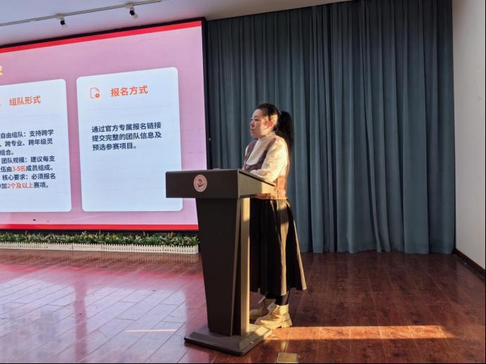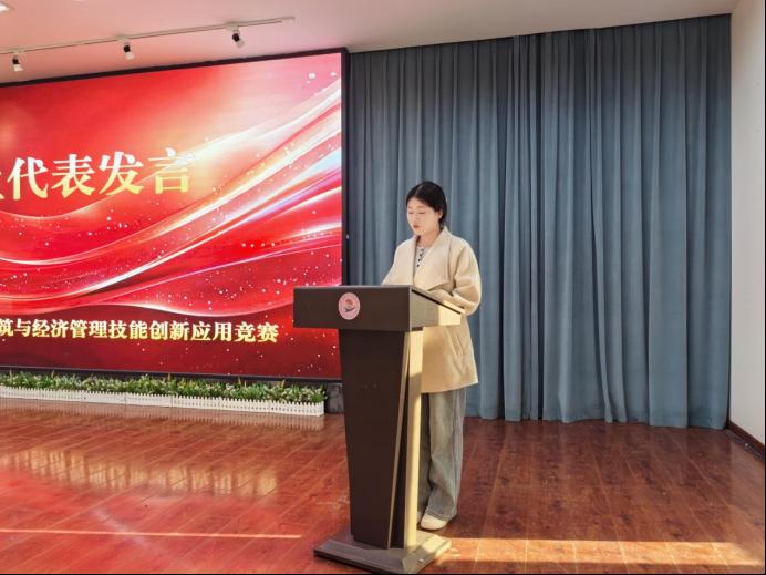 工管231班学生代表王梦莎发言道:“作为新时代大学生,我们深知建筑管理行业需技术与创新理念的深度融合。此次大赛紧扣行业趋势,为我们搭建了实践平台。愿大家以赛为起点,用创新思维回应行业需求,用技术力量书写青春篇章!”其话语真挚,尽显学子锐意进取之姿。同时她呼吁全体参赛同学以赛促学、以赛促练,用创新思维回应行业需求,以专业能力展现青年学子的担当与风采。