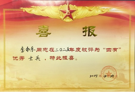 入伍后,李永乐同志始终以“有灵魂、有本事、有血性、有品德”为行为准则,在新兵连期间担任副班长一职,辅助班长完成带兵训练任务,下连以后立足本职工作,秉持“干一行、爱一行、精一行”的态度,刻苦钻研业务知识,多学多问,不断提高自己的业务水平,快速适应新岗位,得到班长和领导的认可,被评为2025年度“四有”优秀士兵。不忘初心,牢记使命,做好本职工作,用青春和汗水书写新时代革命军人的忠诚与担当。
