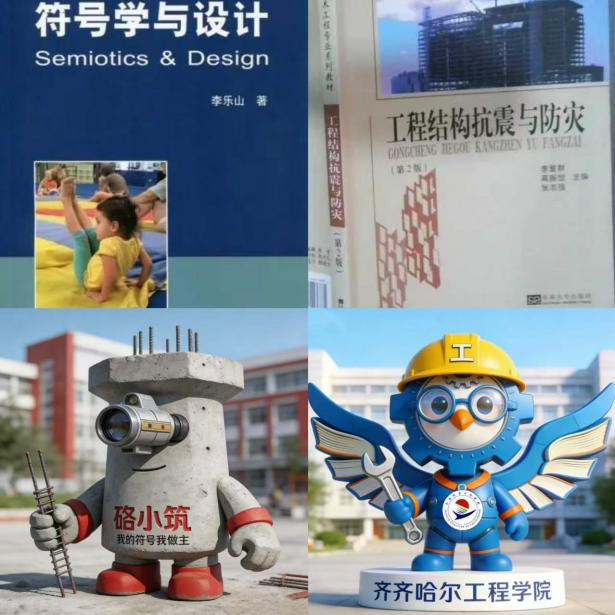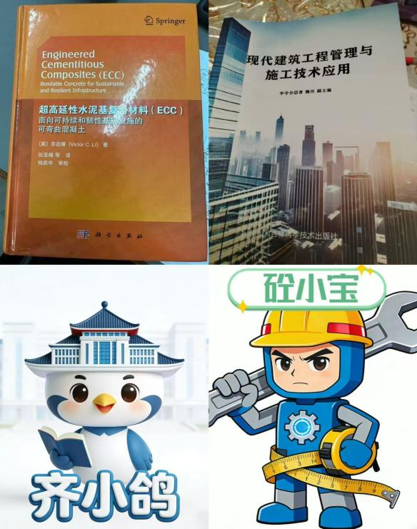 组员袁亮借鉴《超高延性水泥基复合材料》创新原理与《现代建筑工程管理与施工技术应用》实操思维,打造校园吉祥物“齐小鸽”,以白鸽为原型,天青蓝主色调融合校内标志性建筑,翅膀呈翻书姿态,彰显探索精神;专业吉祥物“砼小宝”以混凝土元素为核心,工装造型搭配工具与复合材料试件,凸显技术创新、精工施工特质。