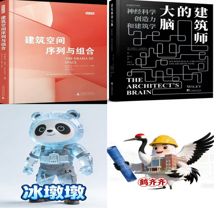 组员邓达吸纳《建筑空间序列与组合》空间布局思维及《建筑师的大脑》创新理念,设计校园吉祥物“冰墩墩”,以冰雪熊猫为原型,冰晶质感融合工程灰与校徽土木线条,缀校训金属牌;专业吉祥物“鹤齐齐”以丹顶鹤为原型,配安全帽、蓝图与装配式构件模型,体现土木设计建造核心素养。