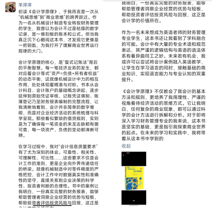 小组成员杨蝶聚焦基础经典教材《会计学原理》,带来了兼具实用性与逻辑性的解读。她针对会计科目设置、复式记账法、财务报表编制等核心知识点,结合日常消费、校园活动经费管理等生活化场景,梳理了会计学的底层逻辑框架。“以前觉得原理性知识枯燥难懂,这次分享让我理清了知识脉络,真正掌握了‘为什么这么记’‘这么算的意义是什么’,为专业学习打下了更扎实的基础。” 她的细致讲解帮助成员们巩固了专业根基,提升了实操应用信心。