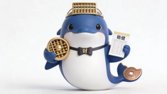 财务管理专业吉祥物设计:财宝豚。以白鳍豚为原型,通体主色调为沉稳蓝搭配活力金。头顶佩戴迷你算盘发箍,脖颈系着刻有“财”字的皮质小领结,左鳍抱着一枚圆润的金算盘,右鳍攥着一张写有“稳健”的微型资产负债表,尾巴末端呈铜钱轮廓,整体造型圆润可爱又不失专业感。