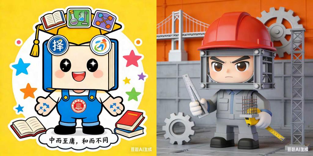 两款吉祥物既呼应人文阅读中的“自主选择”内核,又紧扣土木工程专业的“坚固创新”属性,同时融入校园精神与工科特色,后续将通过Midjourney、SketchUp等AI工具优化视觉呈现,完善2D样图与3D模型,为校园文化建设与专业品牌塑造注入新活力。