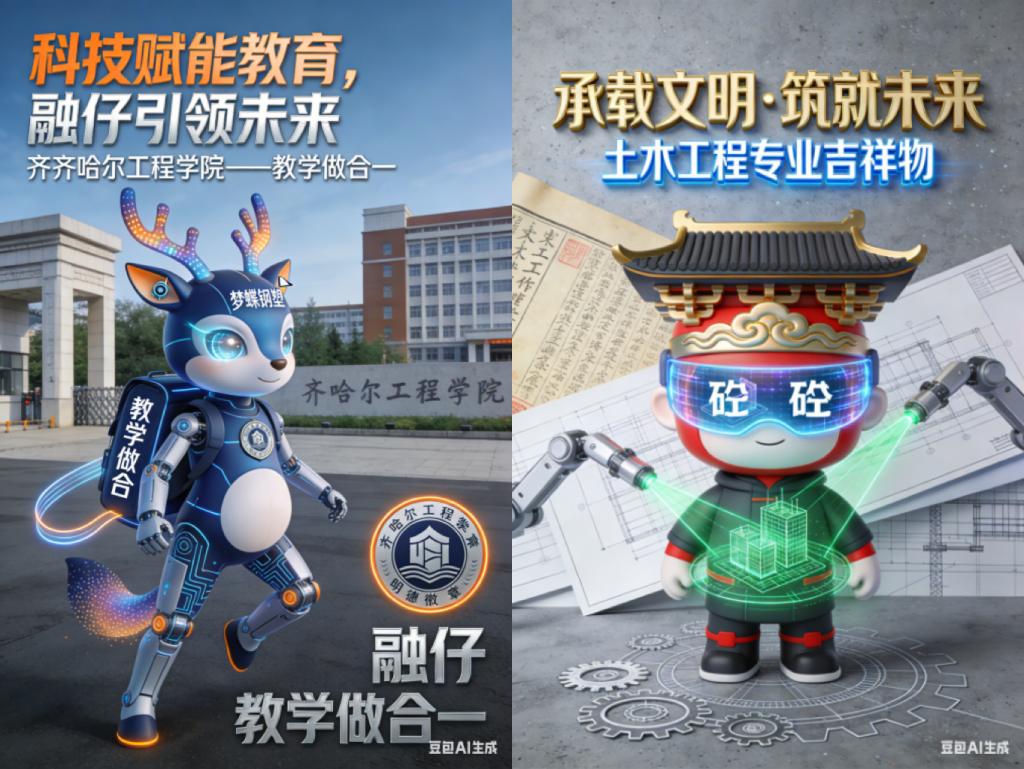 两款吉祥物传递工程与自然、人文的和谐共生理念。后续将通过 AI 工具完善视觉呈现,开发玩偶、数字藏品、虚拟主播等衍生形态,适配校园活动、学术会议、科普传播等多元场景,为专业文化建设与行业形象升级注入新活力。