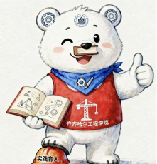齐齐哈尔工程学院吉祥物工创熊以卡通北极熊为原型,身形敦实挺拔,充满活力。它身穿印有“齐齐哈尔工程学院”字样的红色背心,胸口的工程塔吊图案彰显了工科实践特色;左前爪抱着一本翻开的书,右前爪比出“点赞”手势传递积极向上的精神;脚踩的工程安全帽上刻有“实践育人”四字,颈间围巾绣着齿轮与钢笔的组合图案,象征工科实践与人文素养的融合。