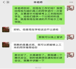 巩佳艺表示:“线上宣讲虽隔着屏幕,但这份分享的热情与责任未曾减少。能通过腾讯会议为母校学子答疑解惑,让他们足不出户了解齐齐哈尔工程学院的优势与魅力,我觉得特别有价值。此次实践不仅锻炼了我的线上沟通与组织能力,更让我感受到知识传递的力量,希望能为学弟学妹的升学之路添一份助力。”