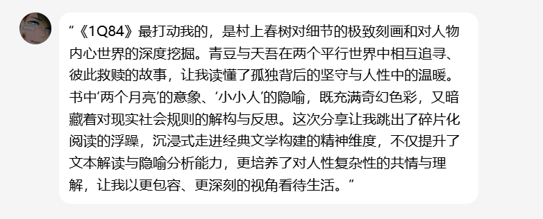 工管232班李承睿率先分享了《1Q84》的阅读体验。他坦言:“这本书彻底打破了我对常规小说的认知,村上春树用双线并行的叙事结构、充满隐喻的情节设定,构建了一个既荒诞又真实的平行世界。原本以为这类带有科幻色彩的文学作品只是猎奇消遣,却没想到能在其中感受到深刻的人性探讨与时代反思。书中对孤独、信仰、爱与救赎的追问,让我开始重新审视自我与世界的关系,也学会在复杂的信息环境中保持独立思考,这种思维的拓展对我的专业学习和生活选择都极具启发。”