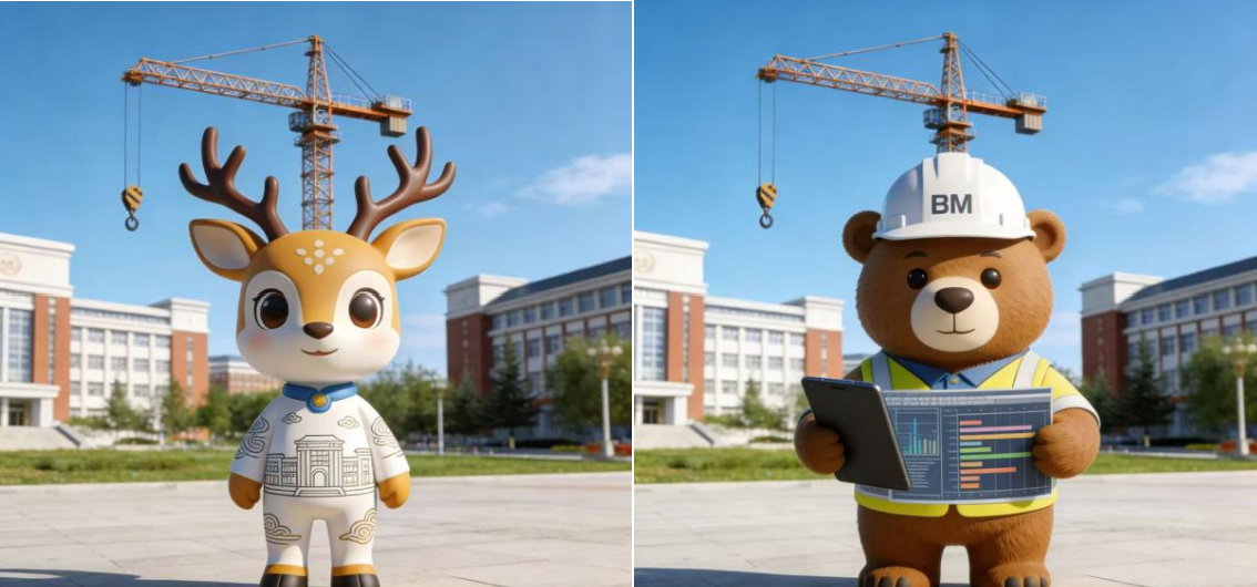 结合长春地域文化、校园工科特色与工程管理专业核心,小组成员分工完成两款吉祥物设计:学校吉祥物·长白鹿:将长白山鹿的祥瑞意象与工程塔吊、图纸经纬线融合,鹿角化作塔吊起重臂,鹿身纹路藏着校园建筑简笔画,成为校园工科文化的鲜活符号。专业吉祥物·工管熊:以“稳重统筹”的熊为原型,搭配工程安全帽、BIM平板、甘特图纹理等元素,生动诠释工程管理“成本、进度、质量”的核心素养。