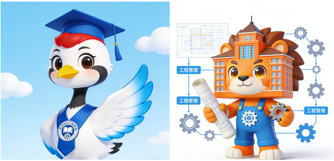 第一幅图以齐齐哈尔“鹤城”的丹顶鹤为核心形象,结合工程管理专业与院校属性设计:寓意工程管理专业学子兼具地域情怀与专业素养,能在领域内展翅成长。