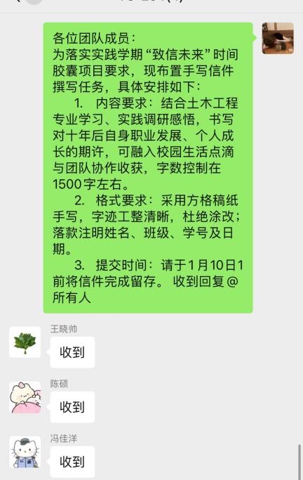 活动期间,团队成员吴佳慧、王晓帅、陈硕、冯佳洋结合土木工程专业学习经历与实践感悟,认真撰写信件。信笺之上,既有对未来职业道路的憧憬——立志成为深耕一线的土木工程师,参与地标建筑的设计与建造,助力城市建设高质量发展,以及团队协作过程中的温暖点滴。