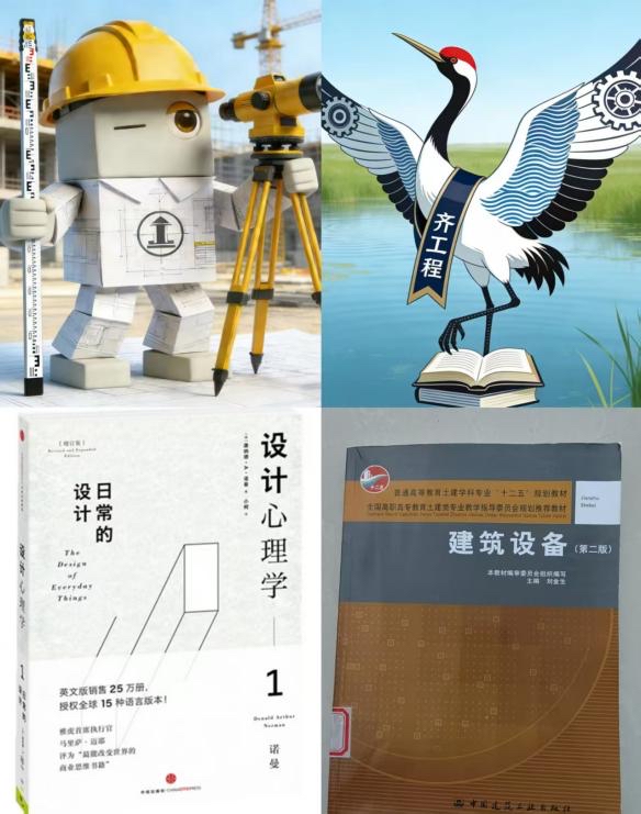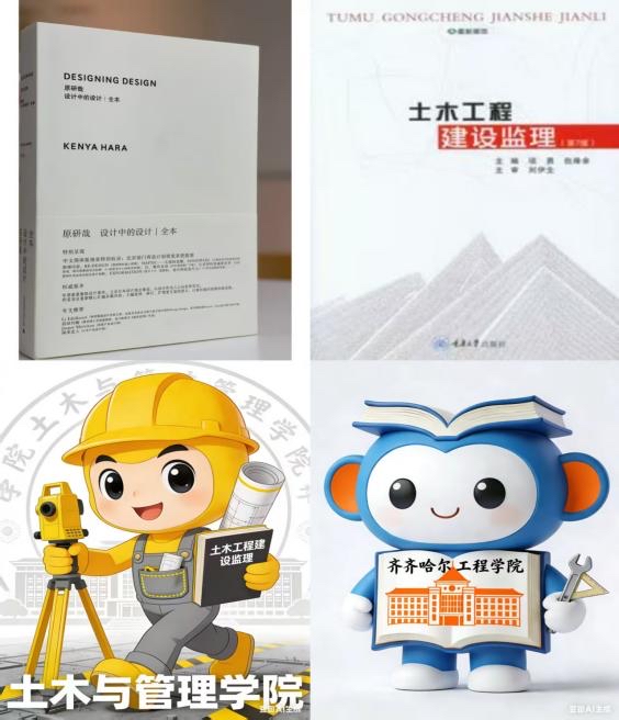 组员邵文帅借鉴《设计中的设计》设计与《土木工程建设监理》实操思维,以工程建设者为原型,搭配安全帽、工装,贴合土木行业属性;手持全站仪、《土木工程建设监理》书籍与工程图纸,体现“土木技术+工程管理”的专业融合,背景融入学院名称与校园建筑,黄灰主色调强化土木行业特征与专业辨识度。