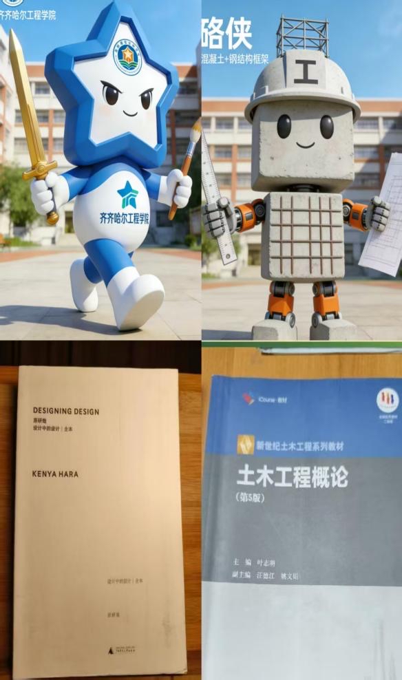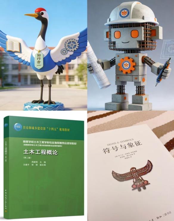 组员杨凯杰参考《符号与象征》人性化理念与《土木工程概论》智能建造逻辑,校吉祥物以齐齐哈尔丹顶鹤为原型,顶戴校徽、身嵌五角星,翅膀化教学楼轮廓,爪握钢笔、脚踩齿轮呼应知行合一,天蓝配白色显工科理性纯净;专业吉祥物砼小石以土木基石为形,刻“砼”字、带塔吊纹路,顶架小桥,配AI眼镜与测量机械臂,大地黄加灰色凸显专业稳固与智能。