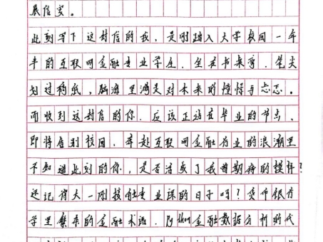 信件围绕专业成长、职业探索与人生选择展开,以互联网金融行业发展为脉络,既回顾了从专业萌新到逐步锚定职业方向的蜕变,也直面考证、实习的当下困惑,更对未来职业道路提出明确要求:坚守金融服务的本质,以数字技术赋能本地金融发展,保持踏实做事的初心,不被行业浮躁裹挟。