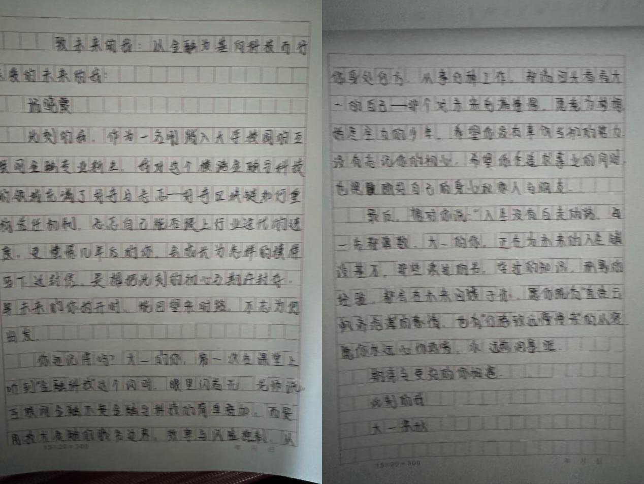 此封书信,不仅是杨晓霞对自身成长作出的郑重承诺,更彰显出新时代互联网金融专业学子扎根行业、追逐梦想、奋勇前行的青春担当。该信件已由杨晓霞妥善保管,计划留待未来某一特定时刻开启。