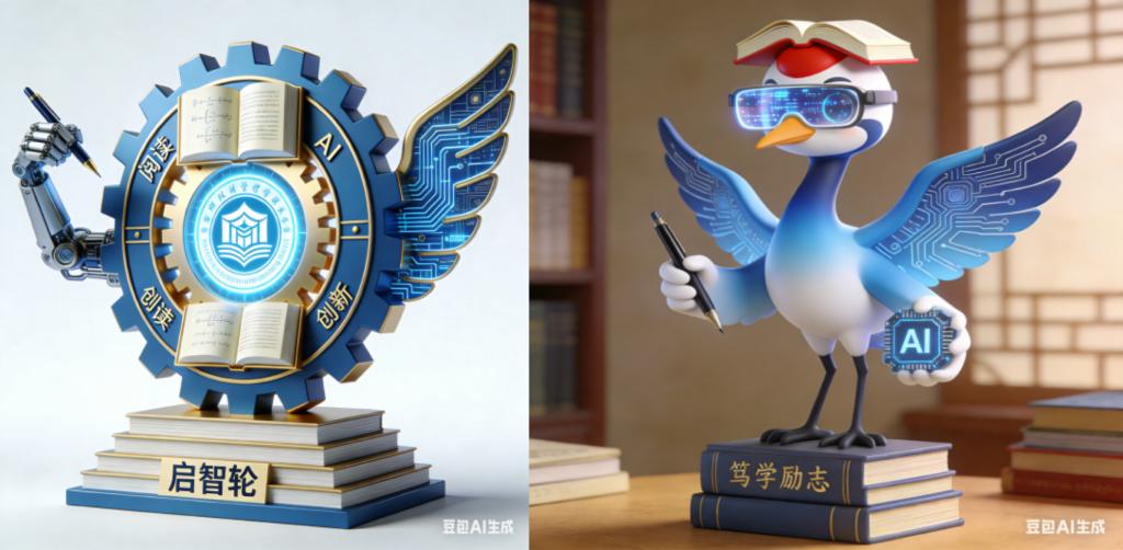本次设计参考原研哉《设计中的设计》“文化融合” 理念与程大锦《建筑:形式、空间和秩序》中建筑结构设计的核心逻辑,以齐齐哈尔城市象征丹顶鹤及校徽齿轮为核心元素,设计校园吉祥物 “书智鹤” 采用科技蓝渐变主色调,融入电路纹理翅膀与 AI 芯片元素,脚踩印着 “笃学励志” 的书本底座,诠释工科院校 “阅读积淀、AI 赋能” 的创新实践精神;设计 AI 工程专业吉祥物 “启智轮” 则以校徽齿轮为主体标识,搭配批注书本、机械臂钢笔及电路纹理翅膀等元素,凸显专业 “阅读启智、AI 塑能” 的精工创新特质。