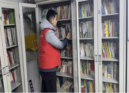 活动现场,身穿红色志愿服的志愿者们分工协作,对书架上的书籍进行细致的整理与归类。他们仔细核对每一本书的位置,将散放的图书有序归位,同时对破损的书籍进行登记整理。经过数小时的忙碌,原本略显杂乱的书架变得整齐有序,各类书籍摆放一目了然,为居民营造了更舒适的阅读环境。