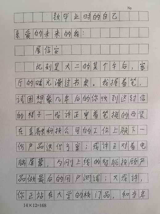 信中,温宇然以行业的发展脉络为线索,回顾自己从初入专业的懵懂,到逐渐明确职业方向的蜕变历程。温宇然明确要求未来的自己,要坚守金融服务的本质,借助数字技术为本地金融发展注入活力,保持踏实初心,不被行业的浮躁风气所影响。这封满载专业理想的书信,被封入“时间胶囊”,待毕业季时开启。