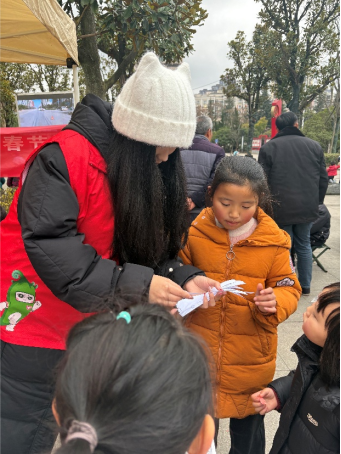 在“不忘初心,志愿服务”项目中,张怡加入凤岗县大学生联合会春晖社,在县城广场开展禁毒宣传志愿服务:她身着印着卡通形象的红马甲、戴着白色猫耳帽,蹲在小朋友身边用折纸卡片讲“毒品长什么样”,带着孩子们玩“禁毒知识问答”小游戏;给驻足的老人递上宣传册,用方言解释“陌生人给的东西不能碰”的安全常识。红马甲配猫耳帽的身影,成了广场上小朋友追着问“姐姐再教我一个知识”的“禁毒小老师”。