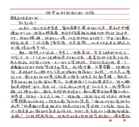 任美城以“时间胶囊,致信未来”为主题,写下给毕业时自己的信:作为财务专业学生,她写此刻“成绩中庸、社恐到躲在人群角落”的日常,也坦诚对未来的迷茫---“不知道能不能扛过实习的报表加班,会不会在数字里出错”,但末尾又落笔“哪怕普通,也要做个靠谱的财务人”,将信件密封后单独存放,约定毕业拆封时“验收这份认真”。
