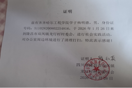 1月26日,土木与管理学院工程造价251杨明德前往四川省内江市隆昌市双凤镇龙灯村村委会办公处,开展“不忘初心、志愿服务”活动,以实际行动为基层环境改善贡献青春力量。