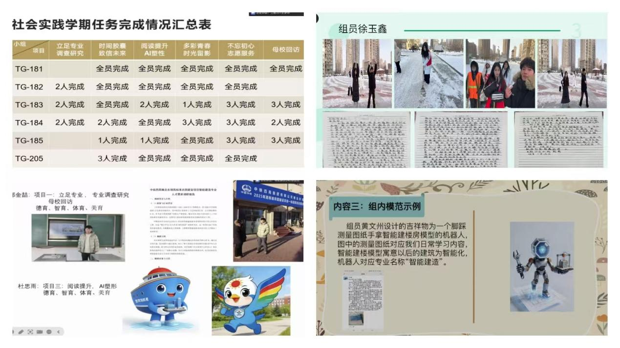会议伊始,各团队负责人依次汇报了项目进展。汇报内容涵盖专业调研、母校回访、志愿服务、AI塑形及吉祥物设计等多个维度。会上,部分已完成视频拍摄并提交成果的小组,得到了老师的肯定;然而,汇报中也暴露出部分学生存在参与度不高、拖延依赖心理严重、个别组长履职不到位等问题。