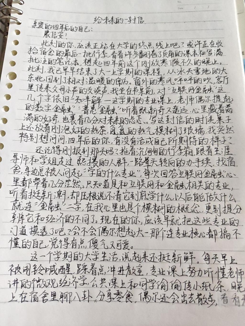 活动中,陈钰以书信为载体,将对未来的期许、学业规划与成长愿景诉诸笔端,在字里行间沉淀自我、明晰方向。这封承载着当下思考与未来憧憬的信件,不仅是对个人成长轨迹的阶段性梳理,更是对未来自我的郑重承诺,鼓励同学们以更坚定的姿态奔赴理想。