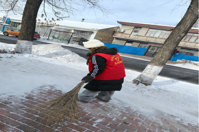 在零下二十多度的严寒天气里,付依冉同学手持扫帚、铁锹,和社区工作人员一起清理了辖区内主要人行道和路口的积雪与冰层。尽管脸和手都冻得通红,但她始终干劲十足,为居民们扫出了一条安全通畅的出行路。活动中,付依冉还向过往居民宣传了冬季防滑和用火用电安全知识,提醒大家注意出行安全。社区居民纷纷为她点赞,称赞她是“有担当的新时代大学生”。