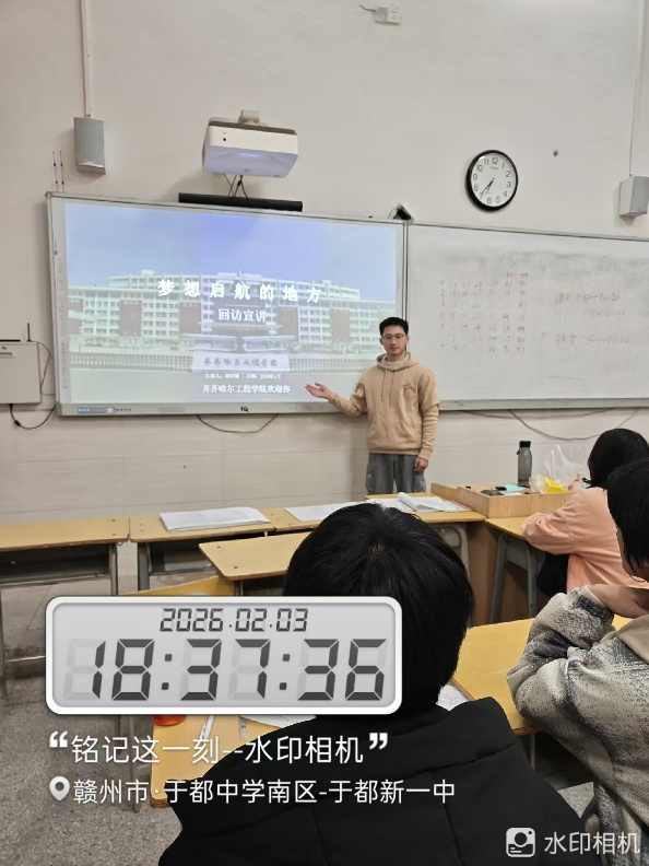 土木与管理学院互金251班王允泽于2026年2月3日在于都中学南区开展“梦想启航的地方”返校宣讲活动,向母校学弟学妹分享齐齐哈尔工程学院的学习生活与成长感悟,传递专业特色与校园温度,点燃青年学子的求学梦。