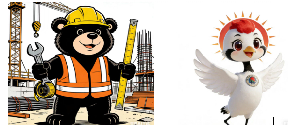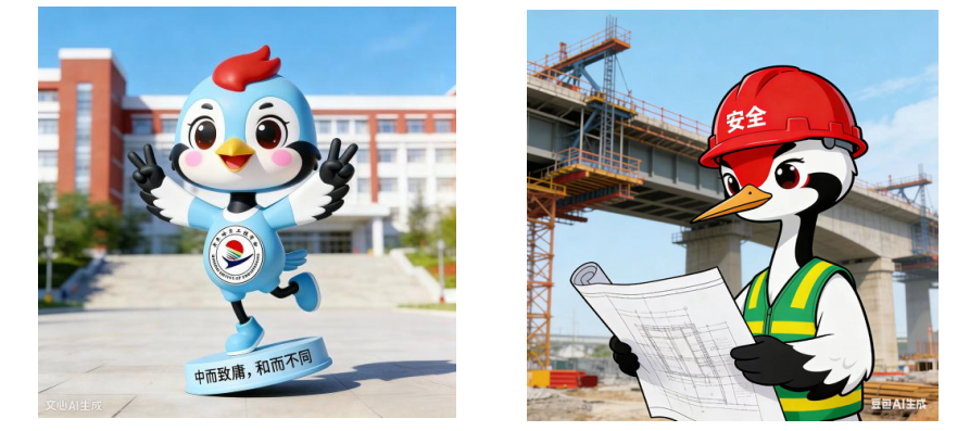 组员郭德志借鉴原研哉《基础工程》“文化融合”理念与《材料力学》建筑结构设计逻辑。这只土木工程主题黑熊吉祥物寓意丰富:黑熊象征力量可靠,对应工程“稳固性”“承载力”要求,象征工程质量坚实;黄色安全帽与反光背心是施工标配,体现行业对安全规范的重视和从业者职业素养;手持工具体现实干精神,稳重姿态象征行业担当。这只融合丹顶鹤特征的吉祥物贴合土木工程:丹顶鹤寓意优雅精准,象征工程“精雕细琢”要求及美学力学平衡,胸前校徽承载院校文化,强化专属属性,象征职业归属感与专业认证;丹顶鹤象征生态友好,契合绿色建造理念,寓意工程与自然和谐共生。