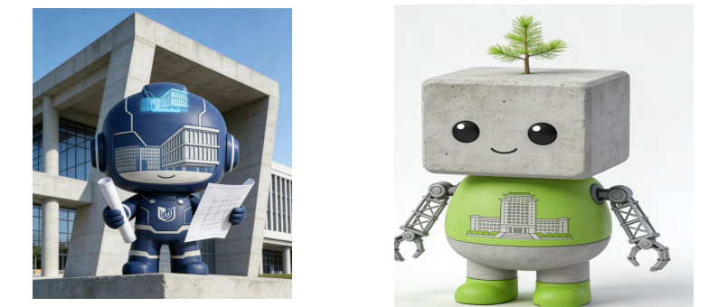形象设计,以混凝土(砼)为核心造型,设计成拟人化的萌趣方块形象,身体纹理模拟混凝土浇筑的肌理,头顶长出嫩绿色的工程松枝,手臂是可活动的钢结构支架,胸口镶嵌学院的建筑地标(如教学楼轮廓),主色调为混凝土灰+生机绿。