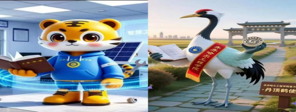 “丹顶鹤使者”以齐齐哈尔市标志性珍禽丹顶鹤为原型,身姿挺拔、红顶白羽,尽显优雅高贵。其佩戴写有“齐齐哈尔工程学院”的红色绶带、别着学院徽章,一手拿带学院标志的纪念币,一手捧绘有工程图纸的书,尽显学院工科属性。