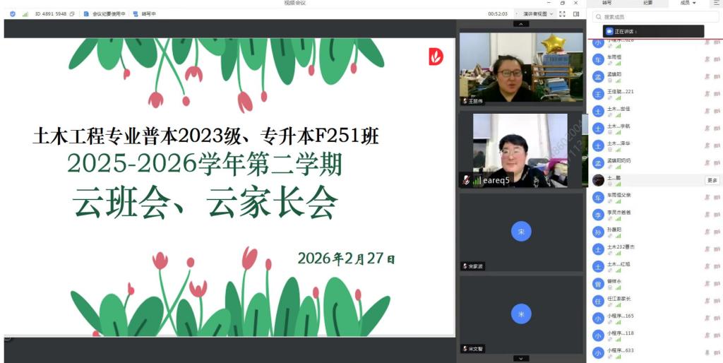 春启新程,共育同行。为推进“三全育人”,复盘上学期学生学业成效,部署新学期工作,搭建家校协同育人桥梁,2026年2月27日,土木与管理学院土木工程专业普本2023级、专升本F251班召开2025-2026学年第二学期云班会暨云家长会。会议由辅导员王丽伟主持,专业长钟美慧、全体学生及家长线上参会。