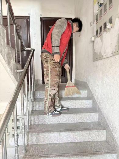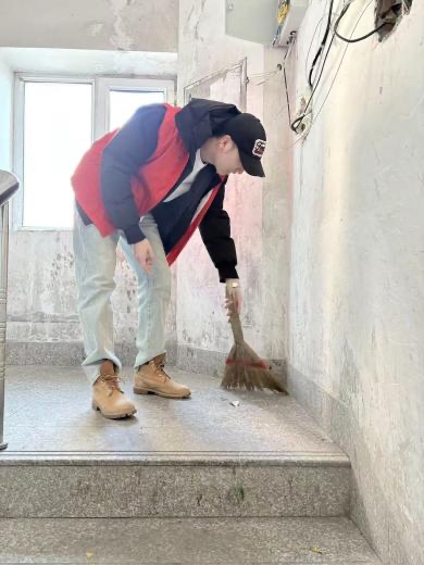 活动前,陈硕与社区工作人员沟通对接,明确楼道清扫的重点区域与安全注意事项——主要针对老旧楼栋的楼道杂物堆积、扶手灰尘、墙面小广告等问题开展清理。活动现场,成员们分工协作、干劲十足:冯佳洋手持扫帚、簸箕清扫地面灰尘,吴佳慧抹布擦拭楼梯扶手,陈硕用小铲子仔细铲除墙面、门窗上的顽固小广告,主动帮助居民搬运楼道内堆放的闲置物品。针对高层楼道清扫难度大的问题,成员们相互配合、分段推进,确保清扫工作无死角。