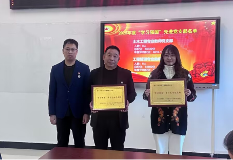 会议伊始,学院对2025年度“学习强国”学习成效突出的先进集体与个人进行了表彰。在先进党支部表彰环节,土木工程专业教师党支部和工程管理专业教师党支部以人均积分第一名、第二名的成绩,荣获了“‘学习强国’学习先进党支部”称号。学院党委副书记刘贤鹏为获奖党支部书记贺全德、李俊颁发荣誉证书,鼓励各支部以先进为标杆,持续夯实学习阵地。