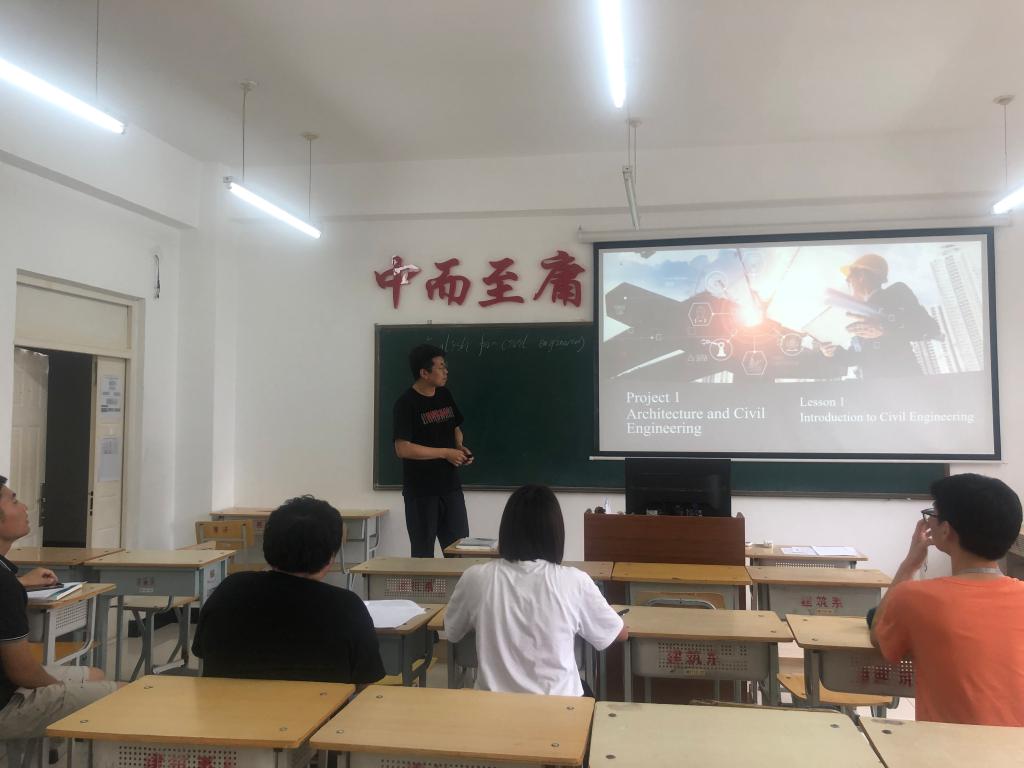 教师尹栋民讲解《专业英语》课程,通过对施工现场的引入,带动同学积极性,教师全程双语授课,教态自然,课堂互动频繁,在授课过程中,激发学生学习主动性,从听、说、读、写四个角度,全面设计课程。