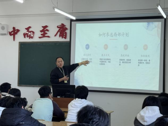 为深入宣传大学生志愿服务西部计划精神,引导广大青年学生树立正确的就业观、择业观与价值观,鼓励青年学子响应国家号召,扎根基层、服务西部、奉献社会,在祖国最需要的地方绽放青春光彩。3月19日,辅导员刘子豪在二号教学区2508教室开展分享,大三大四年级学生参加讲座。